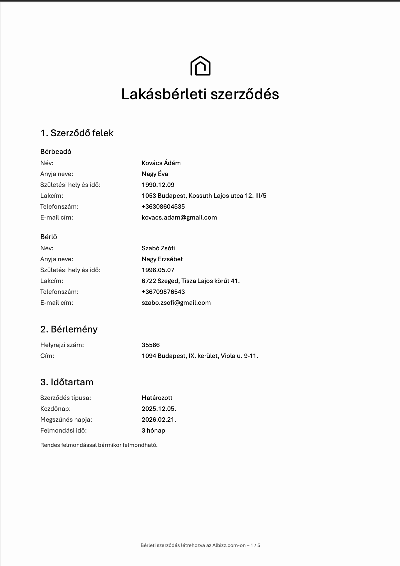 A kétoldali aláírás után mindkét fél a platformon fér hozzá a hiteles szerződéshez (PDF letöltés is elérhető). Az Albizz emlékeztetőket küld, követi a havi bérleti díjakat és támogatja a be-/kiköltözési jegyzőkönyveket.