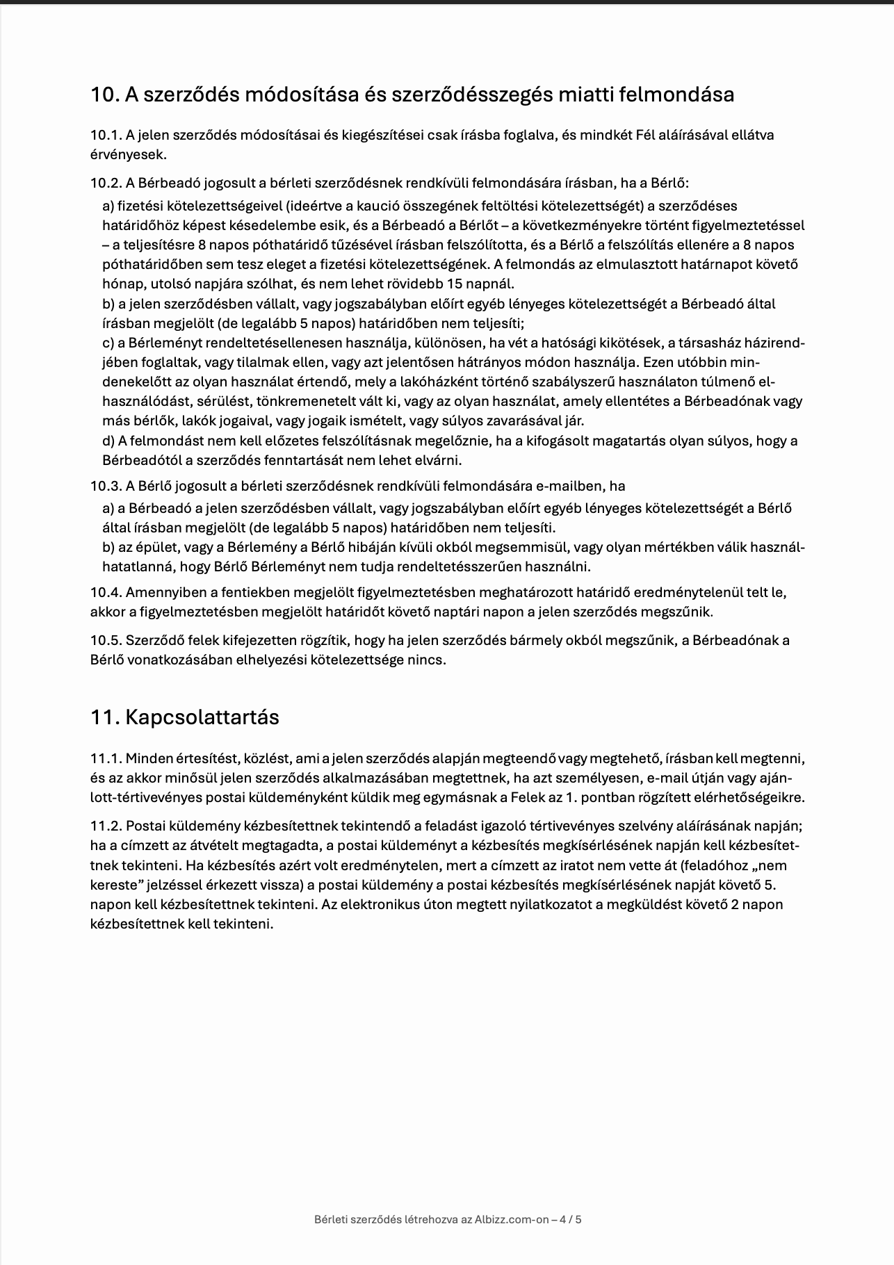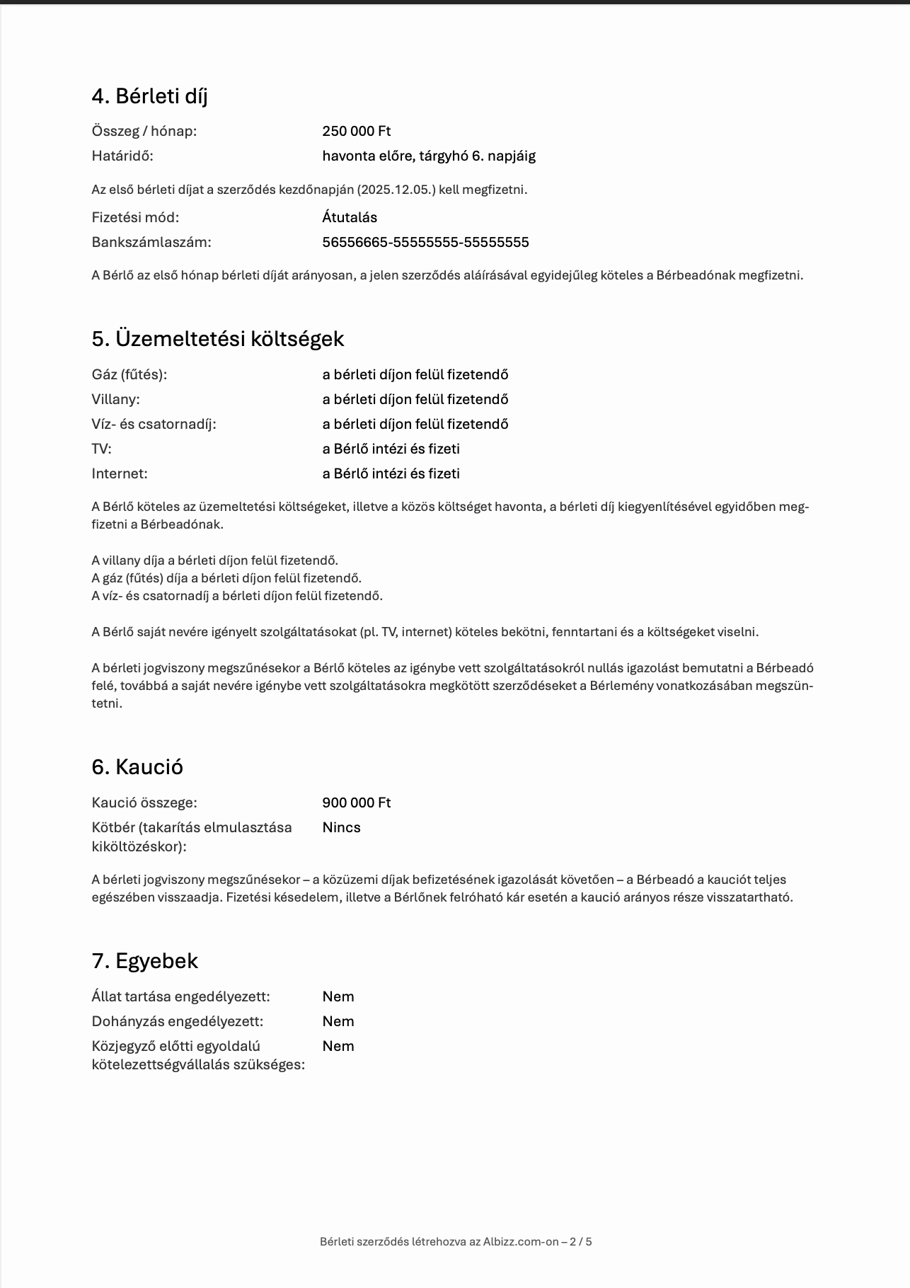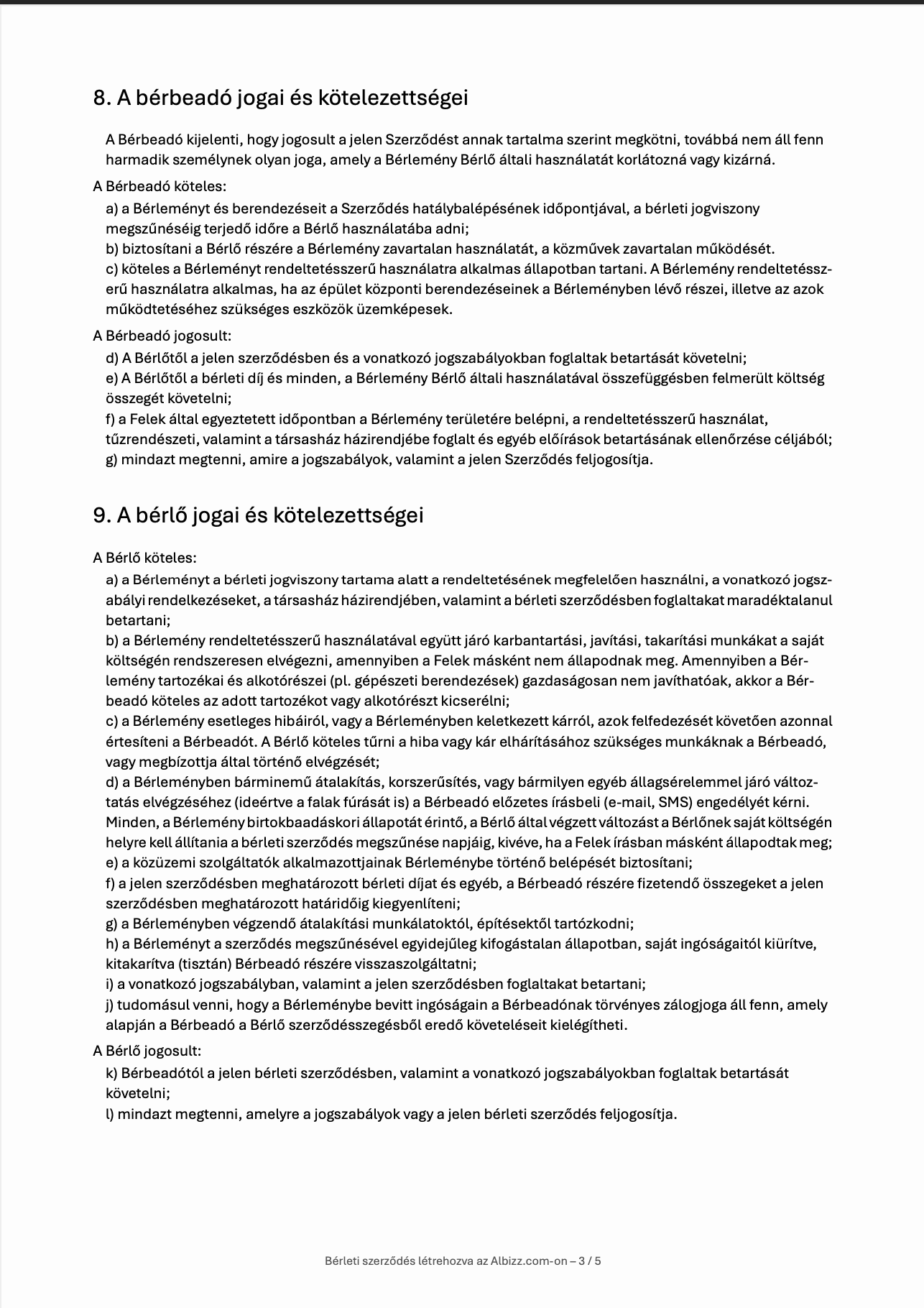 Egy egyszerű, lépésről lépésre haladó folyamat egy jogilag kötelező érvényű bérleti szerződés létrehozásához. Nem igényel előzetes ismereteket, és mindössze 5–6 percet vesz igénybe. A szerződés a következőket tartalmazza: